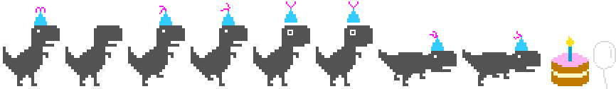 A festive take on the classic Dinosaur game — birthday cake, party hats, balloons — for Chrome’s 10th anniversary.